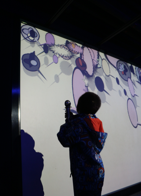 对着麦克喊麦,银幕上就会根据声音出现相应的形状。所以,在这个站位上,经常可以看到喊麦到陶醉,不愿离去的孩子。