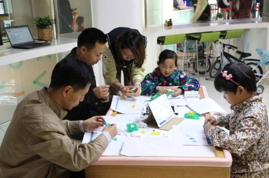 每周,探梦馆都会开放一定名额的亲子体验课。家长和孩子共同参与,完成机器人的拼接、编程。