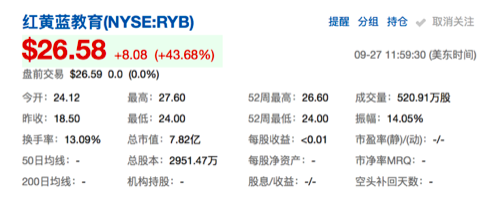 多知网9月27日消息,美国东部时间9点30分,红黄蓝在美国纽交所敲响开盘钟声,成为中国首家独立上市的学前教育企业。红黄蓝开盘价为24.12美元,截至到11点59分(美东时间)已上涨至26.58美元,较发行价增长43.68%。