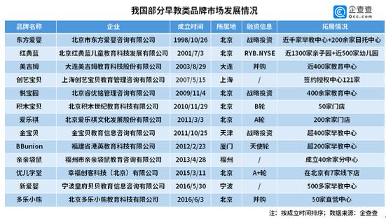 从我国部分早教类品牌机构的市场发展情况来看,成立时间较早的“东方爱婴”目前已实现战略投资,目前有近千家早教中心和200余家日托中心。目前处于战略投资阶段的企业还有位于北京的“悦宝园”和天津的“金宝贝”,其相关的早教中心均已扩展到400余家。此外规模比较大的知名早教品牌中,“红黄蓝”已经拓展到近1300家亲子园和近500件幼儿园,位于宁波的“新爱婴”目前已有超500多家早教中心。