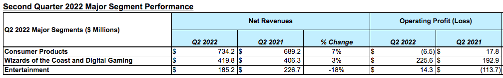 按业务板块来看,第二季度,玩具所属的消费品部门营收7.342亿美元,同比增长7%;海岸奇才与数字游戏业务部门营收4.198亿美元,同比增长3%;娱乐业务部门营收1.852亿美元,同比下降18%,受去年出售其音乐业务的影响。