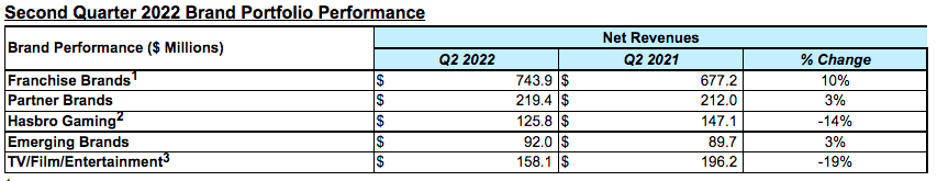 按品牌组合划分,特许经营品牌(万智牌、NERF、培乐多、变形金刚、地产大亨、BABY ALIVE、小马宝莉、小猪佩奇)营收为7.439亿美元,同比增长10%。合作品牌营收为2.194亿美元,同比增长3%。孩之宝游戏品牌营收为1.258亿美元,同比下降14%。新兴品牌营收为9200万美元,同比增长3%。电视、电影、娱乐品牌营收为1.581亿美元,同比下降19%。