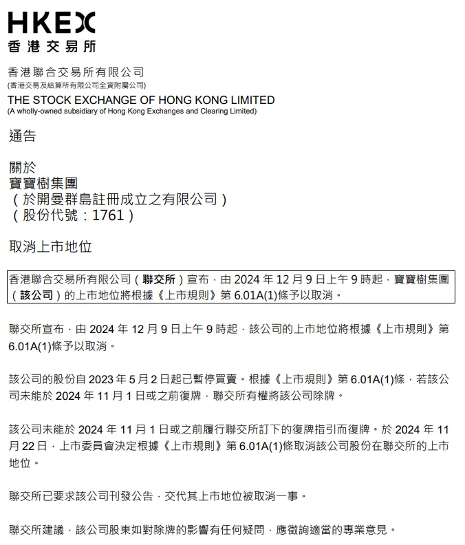 宝宝树集团12月4日在港交所公告称,于2024年11月22日,公司收到香港联合交易所有限公司发出的函件,当中表示联交所上市委员会认定公司未能于2024年11月1日复牌截止日期前达成复牌指引,并决定根据上市规则第6.01A(1)条取消公司股份的上市地位。