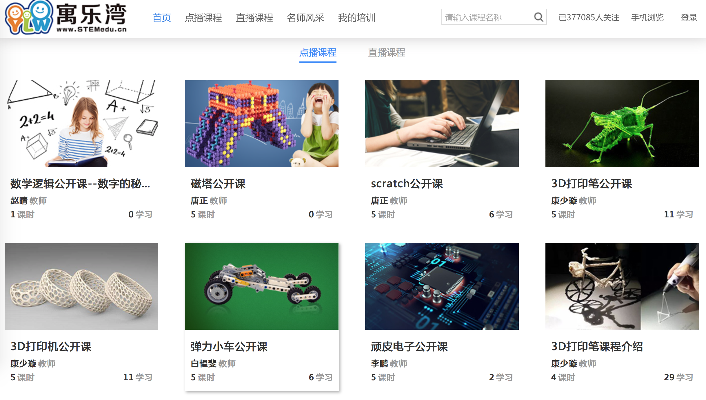 和校内端不同,家庭端的场景更多是孩子自己或者在家长的指导下进行的学习,打开寓乐湾官网,可以看到各式直播、录播课,比如数学逻辑、3D打印公开课等。这些课程的特点是:时长短、产品小、价格比较低 ,便于孩子和家长不断的重复性的购买。