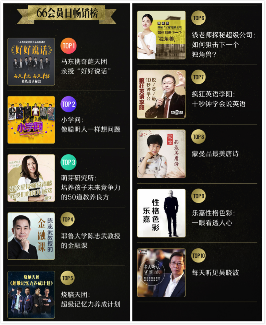 截至6月6日20点,喜马拉雅已发展会员约221万人,在知识内容方面,马东领衔“奇葩天团”推出的的成长类课程《好好说话》与《小学问》非别位于畅销榜前两名: