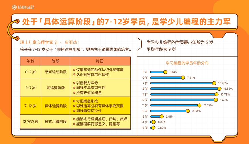 当然,与其他素质教育相比,少儿编程教育具备一定的特殊性,需要保障学习成果的同时兼顾青少年的学习兴趣。对于青少年,培养编程思维也拥有一个“黄金年龄段“。根据报告,7-12岁的青少年群体是学习少儿编程的主力军。瑞士儿童心理学家让·皮亚杰曾表示,孩子在7-12岁处于具体运算阶段,更有利于逻辑思维的培养。根据报告调研,学习少儿编程的学员最小年龄为5岁,平均年龄为9岁。