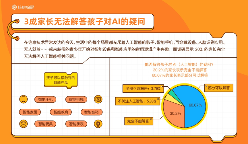 但是让人印象深刻的是,30.2%的家长完全无法解答人工智能相关问题,60.67%的家长可以部分解答,仅有3.79%的家长可以完全解答孩子对人工智能的疑问。