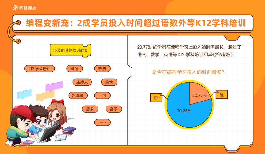 据悉,报告基于超过65万同期在读学员大数据以及4.5万份调研数据,历时近两个月深度调研与分析制作而成。报告显示7-12岁的青少年群体是学习少儿编程的主力军,20.77%的孩子在编程上投入的时间超过语文、数学、英语等K12学科培训以及其他兴趣培训。