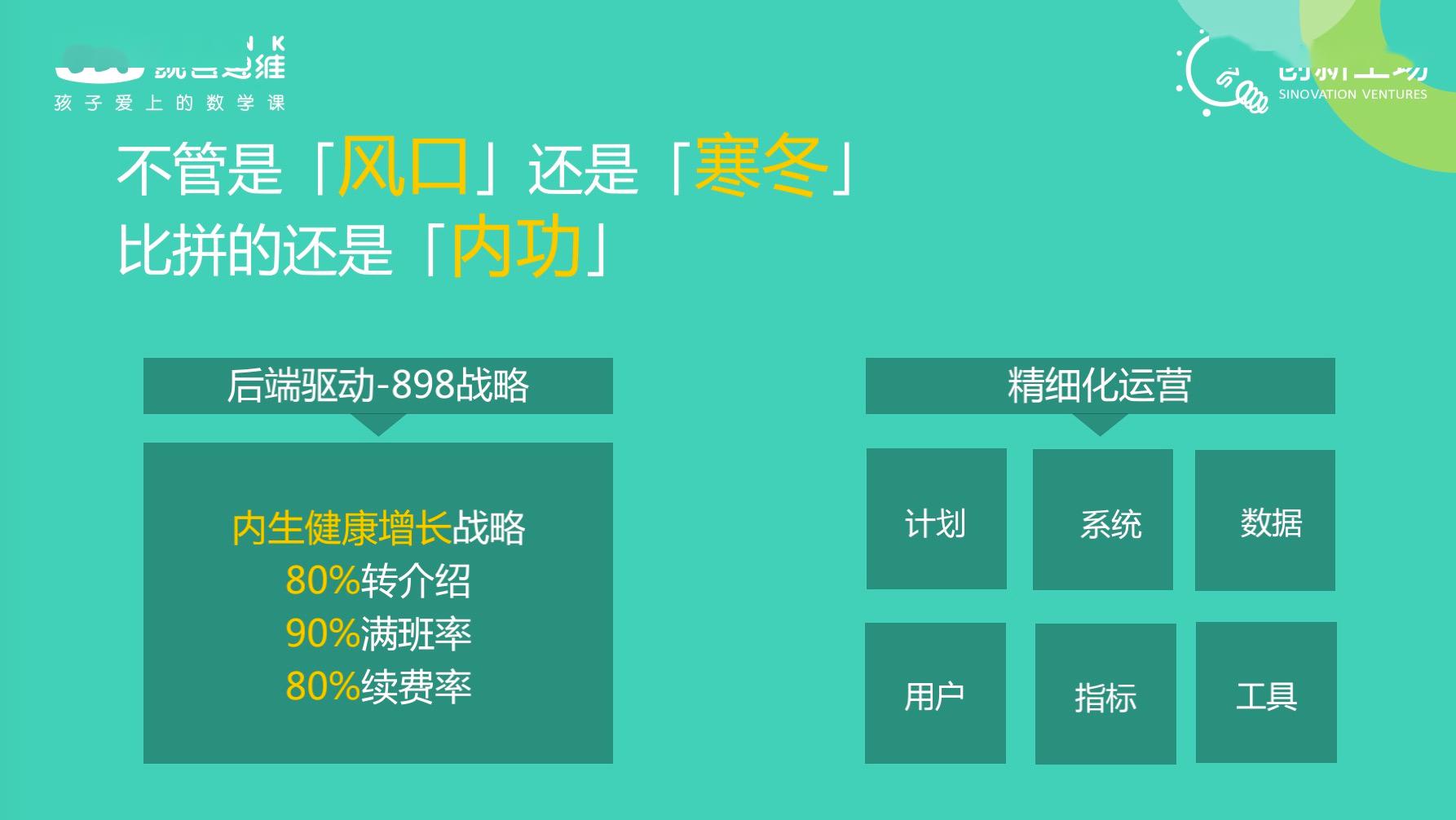 我们一直讲增长,但是我们认为增长其实核心本质还是后端驱动的,整个的增长是因为交付好的教学体验、教学结果,带来好的口碑,因为后端的教研跟教学交付特别好的结果,所以能够带来正向的增长,这个叫后端驱动增长。那豌豆是这样增长的,所以我们把所有健康增长的核心指标,作为公司的核心战略,我们叫898战略。意思就是80%的增长靠转介绍、口碑续费,90%满班率,80%的年续费率,898战略非常好记,是所有人深入人心的一组数字。整个公司的资源配跟kpi考核围绕这个展开。这个事情在豌豆其实是去年整个一年的主旋律。