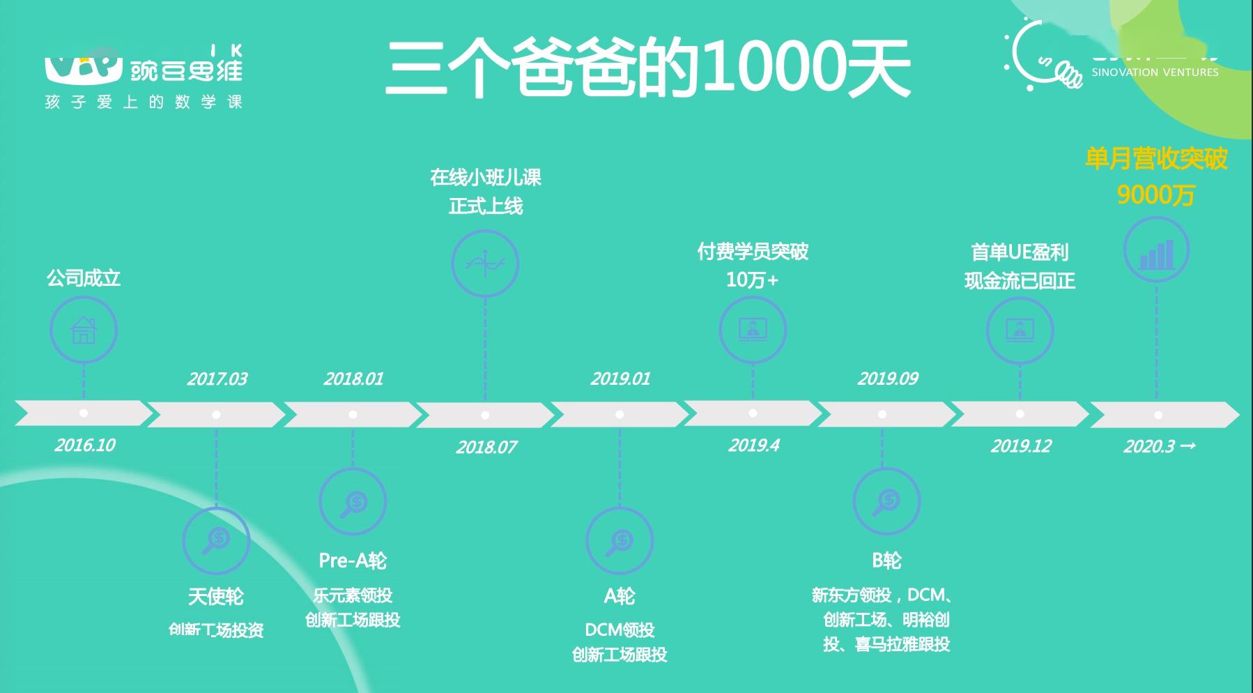 豌豆思维的创业历史,我们自己总结叫三个爸爸的1000天。我们有两个关键词语。第一个:我们的创始人的是六个孩子的爸爸,那创业的原因就是因为我们看到孩子需要好的数学课,我们认为数学是非常重要的科目。而豌豆有更好的这个方法让孩子爱上数学。所以我们在1000天前创业做豌豆,可以看到三年多以来,我们遇到很多困难都被克服了。