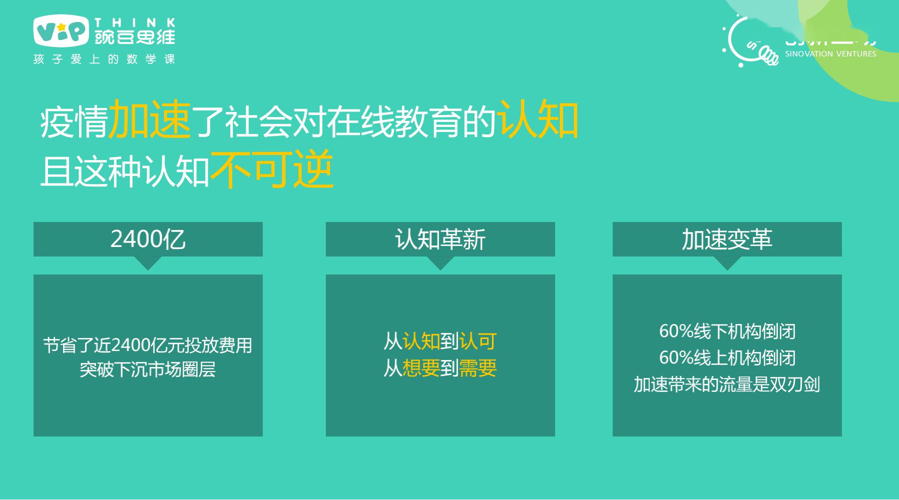 原因有三点,就是我们认为第一个,在线教育被强行地上了一次投放。之前不论我们怎么投放,家长可能都不一定会去上网课,现在被学校强制上网课了,而且很多时候需要被消耗时间,必须上网课,所以各类的流量各类下载安装,省了很多的费用。第二就是认知革新。以前是不被认知,现在用户自己真的需要上,所以也是很大的变化,整个的认知会被革新。第三个加速变革,因为我认为这个流量带来的是一个很大的双刃剑,据说60%的线上线下机构会倒闭,疫情会加速行业的洗牌跟淘汰。