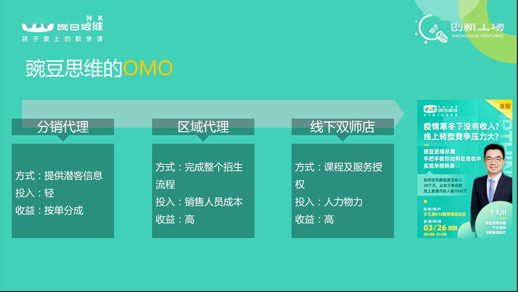 那在危机中另外一个重要的事情,是我们能够想,最好做些贡献,因为行业中很多的线上机构有很多自救的群,我也在里面看到,大家还在讨论不能上课,没有收入,怎么办?那豌豆在那个时间点非常迅速,我们也调整或提出来豌豆愿意贡献一份力量,也按照我们现在交付的方式,我们其实有办法来做出比较好的利润跟服务的机会出来的,我们也跟大家分享。所以我们也看到OMO招商大会,也开了直播,也开了很多渠道去合作。其实包括区域分销、区域代理,都可以去合作。那么不管提供信息还是提供客户,还是提供这个内容。我们开了这个直播方式的招商,面对整个教育行业的朋友们分享,详细分享了豌豆在线上转型过程中的体会和理解。