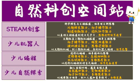 第二,自然科创空间站。课程涵盖STEAM创客、少儿机器人、少儿编程、少儿自然探索;