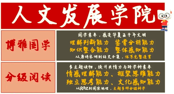 第三,人文发展学院。课程涵盖博雅国学、分级阅读;