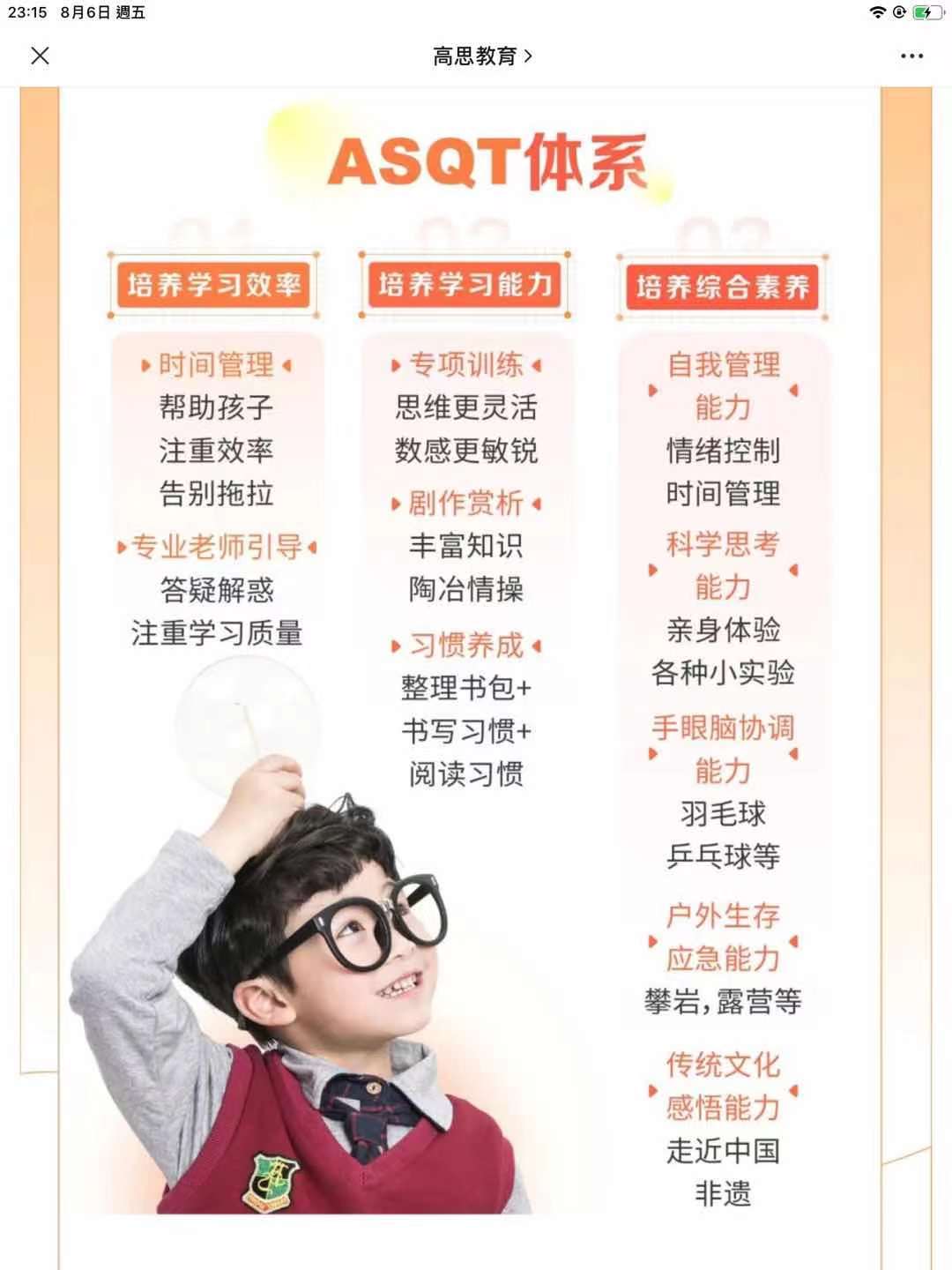多知网8月6日消息,高思教育今日通过其官方微信公众号发布ASQT产品体系,旨在培养孩子学习效率、学习能力和综合素养,帮助其德智体美劳全面发展。