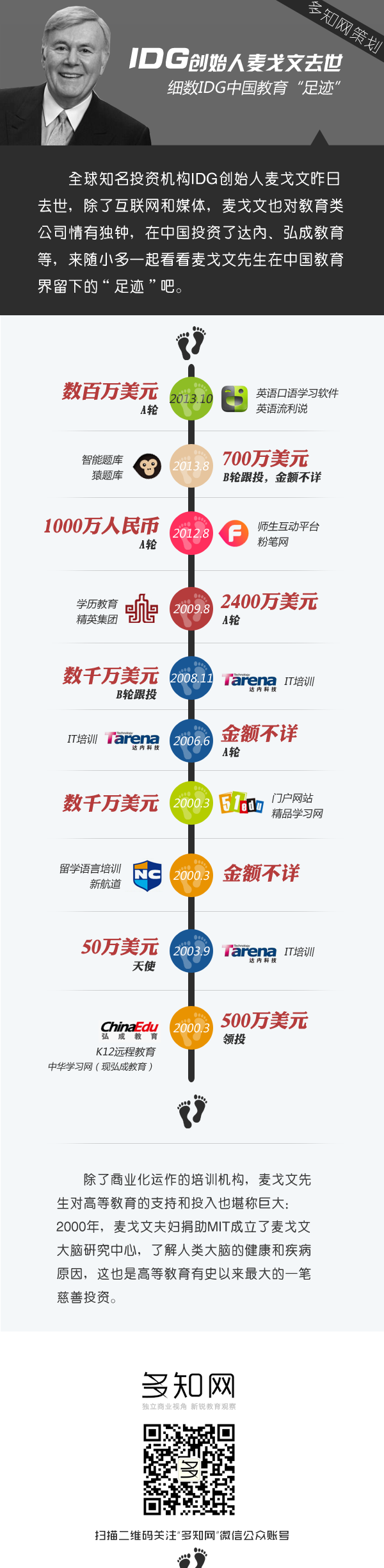 全球知名投资机构IDG创始人麦戈文去世,除了互联网和媒体,麦戈文也对教育类公司情有独钟,IDG在国内投资了达内、弘成教育等,来随小多一起看看麦戈文先生在中国教育界留下的“足迹”吧。