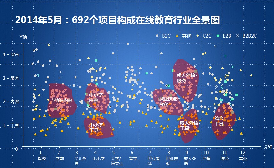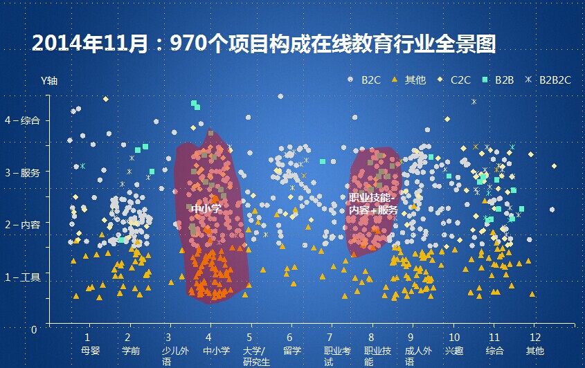 研究之后发现一个特点,到下半年,11月份的时候,我们第二次做了这个工作。到下半年的时候,当时大概有970个项目。能打得开网站的,当时已经有几十个项目消失了,网站打不开了,APP没人运营了。这970个项目我们就做了一个分类。发现一个特点,什么特点呢?大家看,其实我们的这个教育,比如说今天以教育的名义坐到一块了。其实咱们仔细说说,咱们都不是一个行业的。
