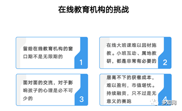 在线教育机构同样面临一些挑战。当前在线教育,K12在线大班课未来会不会热度消退,可能性是存在的。与此同时,线下小班课的模式是长期生存,因为它是能解决很多大班课解决不了的问题。