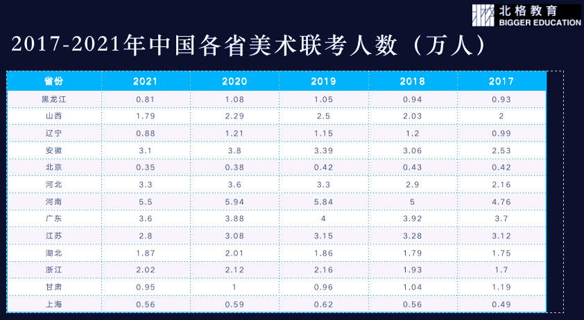 但是另一组数据,2017年-2021年中国各省美术联考人数,黑龙江2017年9300人,2018年9400人,2019年10500人,2020年10800人,2021年8100人,为什么降了?