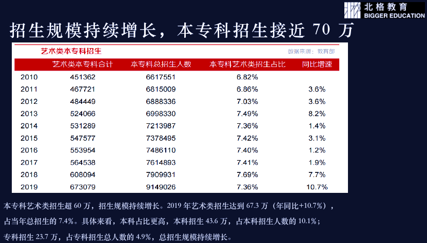 艺考的本专科录取人数,从2010年的45万人,到2019年67万人,每年6%-7%左右的增长率。