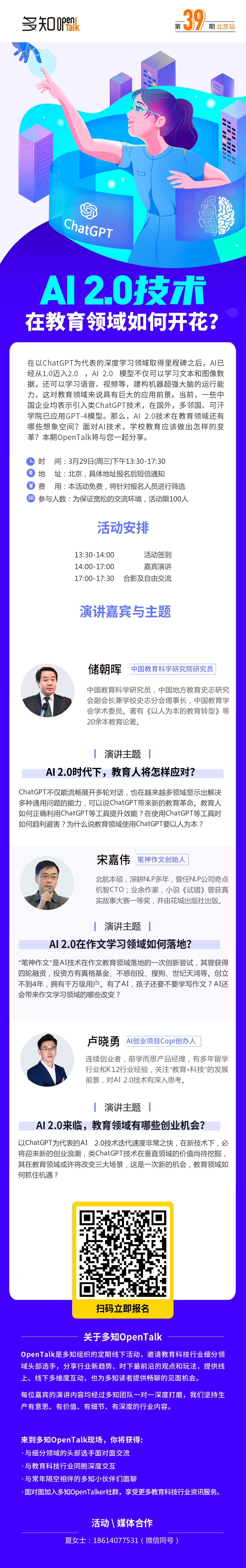 OpenTalk是多知组织的定期线下活动,邀请行业细分赛道头部选手,分享行业新趋势、时下最前沿的观点和玩法,提供线上、线下多维度互动,也为多知读者提供畅聊的见面机会。