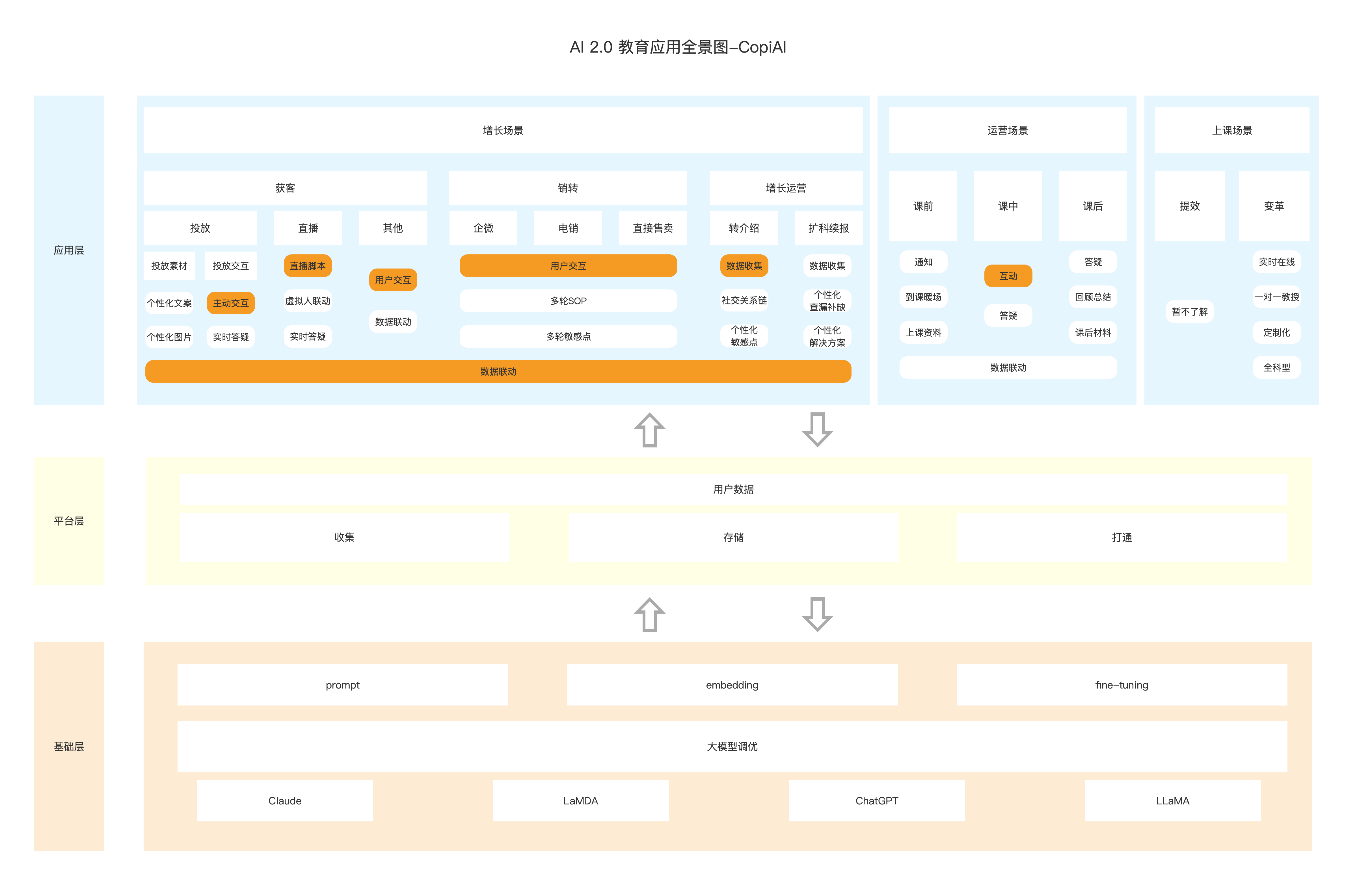 这是我画的一张全景图,我将教育场景划分为获客增长场景、运营场景、上课场景,分成了应用层、平台层、基础层。