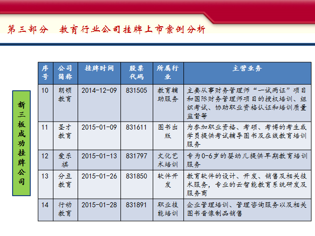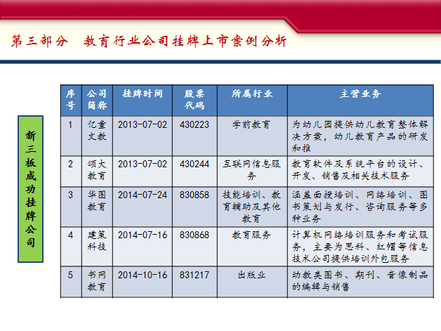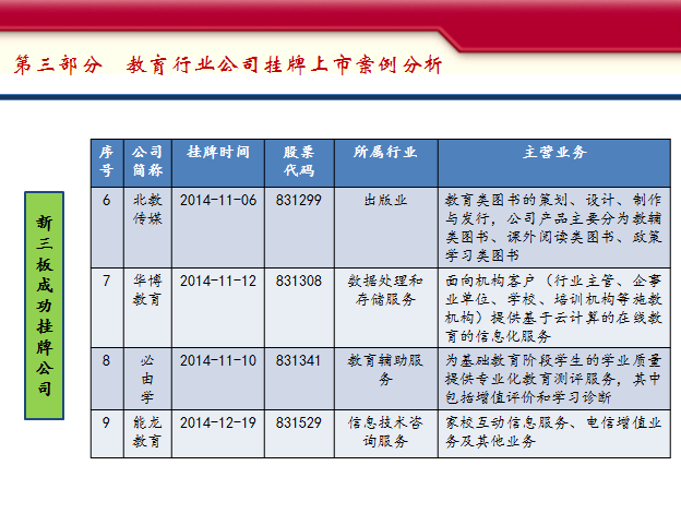 第三部分是目前登录新三板的一些教育类的公司,这块我就不多说了,看一下有哪些公司,重点有哪些业务,大家可以参照一下。