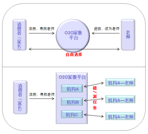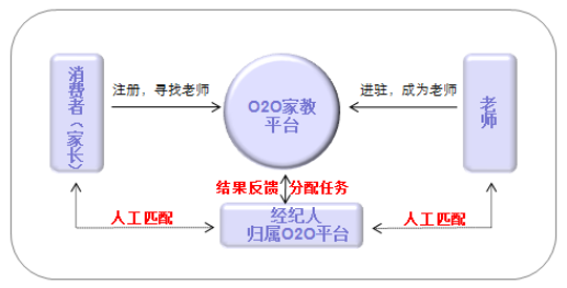 评价:该模式与传统中介类似,把传统形式直接搬到互联网时代。老师由平台掌控,平台接到订单又经纪人跟进并且根据距离、需求等推送给老师,由老师进行家教服务。该模型好处是经纪人能帮助消费者协调老师,使老师保持长期性可持续性的良好服务。现实中报道坏处:老师接单后不如约到现场情况严重。