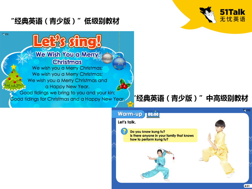 级别体系。51Talk有个16级的英语级别体系,第16级接近于母语人士的水平。青少的级别体系最高到Level 9,相当于优秀初中毕业生的水平。