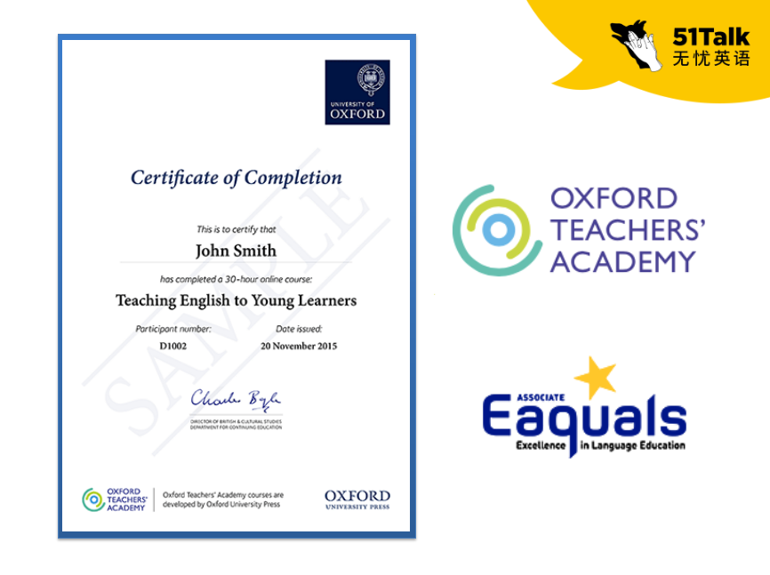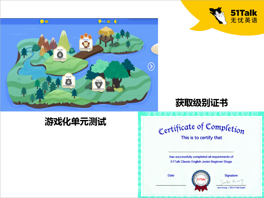 51Talk的付费课之后还有单元测试、级别测试并颁发证书。这个证书相对来说比较权威,我们跟第三方机构合作,让第三方机构出题,最后给孩子出一个成绩评定结果。