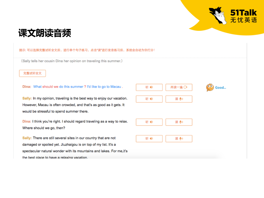 51Talk的课文朗读音频,在学生跟读之后会有评分,这也是我们的优势所在。