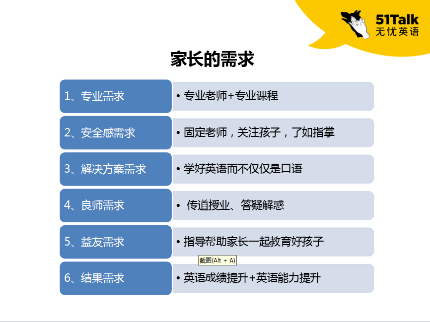 家长需求。51Talk非常重视家长,老师在面对学生的时候,间接会面对家长,或者说不得不面对家长。有这种经历,老师给孩子上课的时候,有时候家长会突然出现,如果家长会英文就会直接跟老师讲,如果不会英文他会选择汉语,在百度里翻译一下发给你。我们对满足家长需求有一些自己的总结。