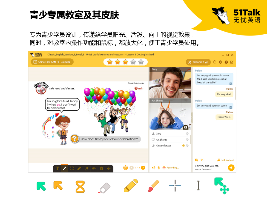 青少教育非常难的点在于让孩子的注意力随着你走。51Talk作为在线机构,我们在细节上下功夫来保证孩子的注意力。