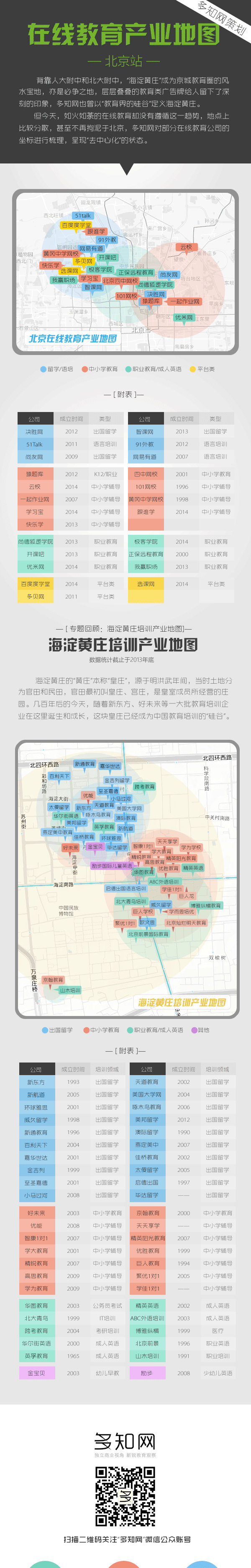 背靠人大附中和北大附中,“海淀黄庄”成为京城教育圈的风水宝地,多知网也曾以“教育界的硅谷”定义海淀黄庄。但今天,如火如荼的在线教育却没有遵循这一趋势,地点上比较分散,多知网对部分在线教育公司的坐标进行梳理,呈现“去中心化”的状态。