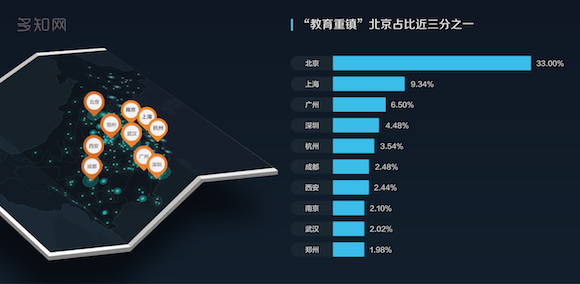 尤其北京,作为“培训产业必争之地”,比例高达33%,远远超过上海、广州,甚至超过其他所有省会城市之和(26.43%)。