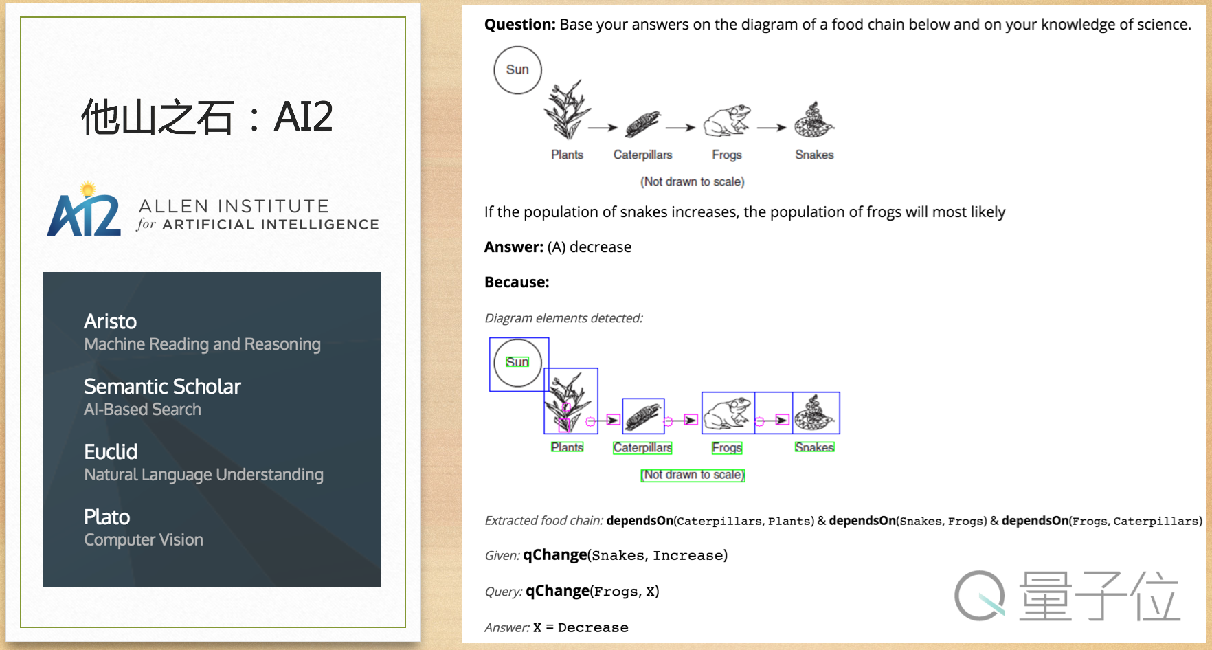 AI2是微软的联合创始人艾伦创立的研究人智能机构,想做通用人工智能,通过答题的方式实现。他们其中一个产品是答题系统。比如,根据食物链的图,太阳、植物、虫子、青蛙、蛇,问:当蛇的数量增长的时候,青蛙的数量怎么样?AI给的答案是会减少。把图片做识别处理,用一个算法得出一个结论。