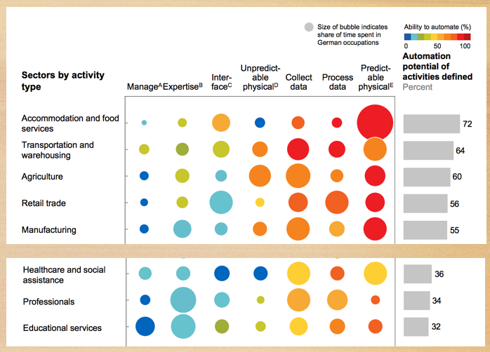 麦肯锡报告对整个德国的持久行业用7个维度做了分析,圆圈的大小代表维度上所需要的时间占比,红色是被替代的可能性最高,蓝色最低。第一个是餐饮行业,最容易被AI自动化所取代;最低的是教育行业,它认为被自动化的比例非常低。