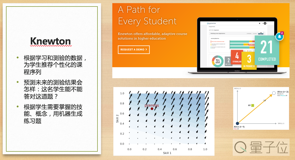 Knewton在机器学习里面做了什么事情?把数据拿出来,根据得到的数据判断这个学生该学什么,通过这些数据预测出你需要掌握的知识内容。