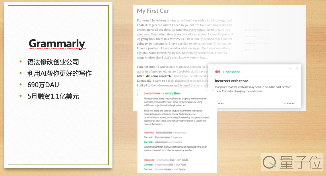 Grammarly,有很多朋友说在用他们服务,Grammarly做AI写作,通过数据和算法告诉你哪些是错的,哪些词是可以修改的,在浏览器做一个插件就可以用使用。